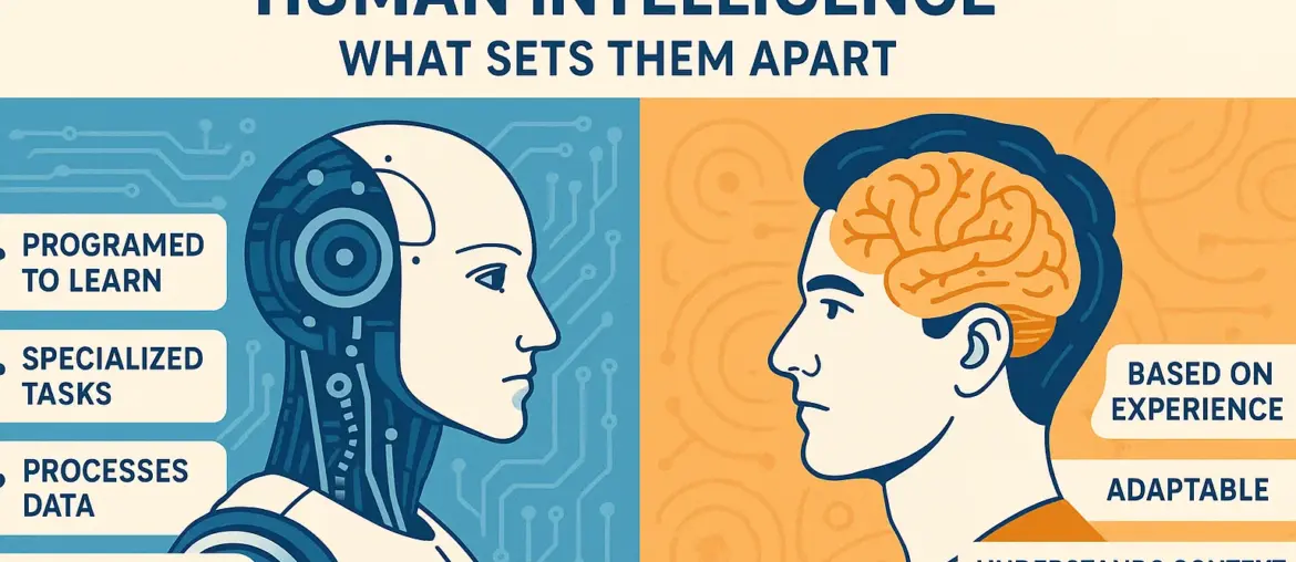 Human intelligence is biological, adaptive, and holistic, shaped by evolution and experience. It encompasses reasoning, learning, creativity, and emotional depth. AI, on the other hand, is engineered intelligence, built from algorithms and data structures that mimic particular human abilities but lack consciousness or self-awareness.